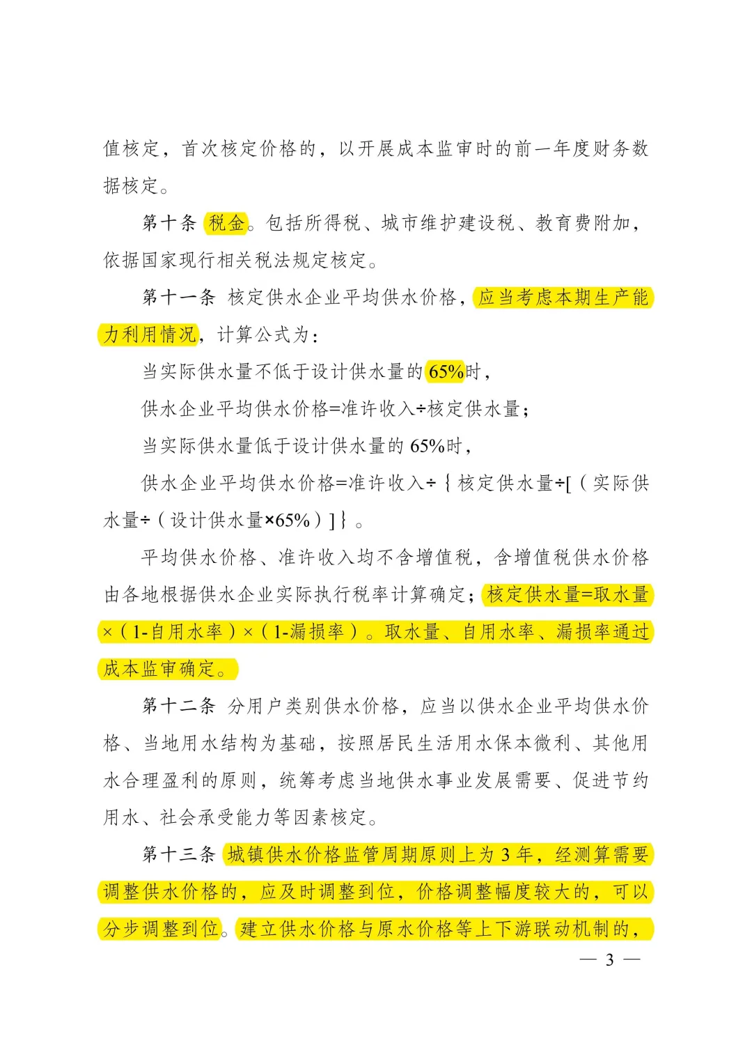 《城鎮(zhèn)供水定價(jià)成本監(jiān)審辦法》明確了定價(jià)成本構(gòu)成和核定方法。主要內(nèi)容:一是明確城鎮(zhèn)供水定價(jià)成本構(gòu)成范圍。按照合法性、相關(guān)性、合理性原則,規(guī)定城鎮(zhèn)供水定價(jià)成本包括固定資產(chǎn)折舊費(fèi)、無(wú)形資產(chǎn)攤銷(xiāo)和運(yùn)行維護(hù)費(fèi),并對(duì)計(jì)入定價(jià)成本的項(xiàng)目作了具體規(guī)定。二是明確定價(jià)成本和有效資產(chǎn)核定方法。細(xì)化明確固定資產(chǎn)折舊、原水費(fèi)、材料費(fèi)、動(dòng)力費(fèi)、人工費(fèi)等成本費(fèi)用的審核標(biāo)準(zhǔn),對(duì)可計(jì)提收益的有效資產(chǎn)范圍及其核定方法做出明確規(guī)定,對(duì)供水企業(yè)職工人數(shù)定員、管網(wǎng)漏損率控制等建立激勵(lì)約束機(jī)制。