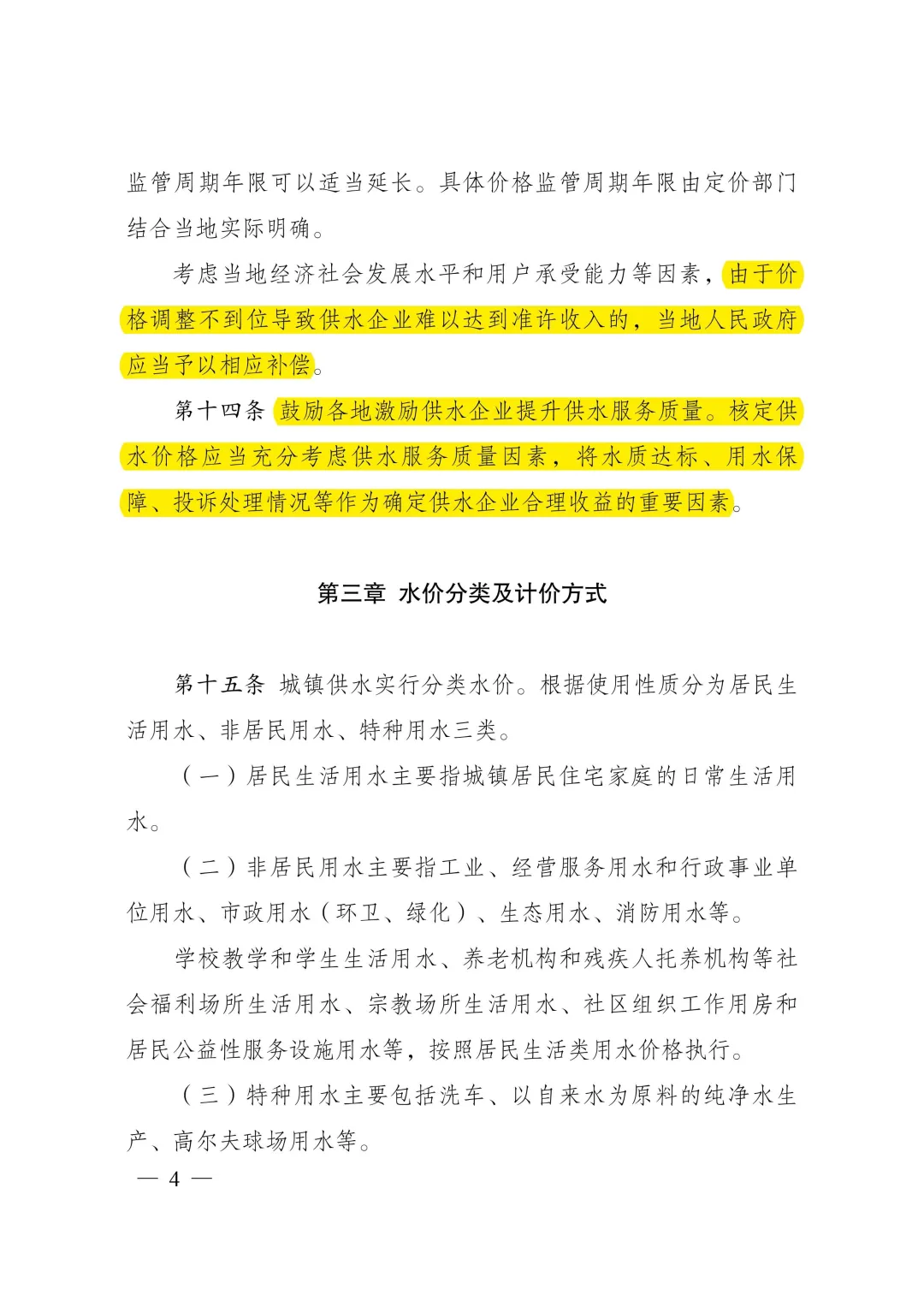 四是建立了供水價(jià)格定期校核機(jī)制和補(bǔ)償機(jī)制。明確城鎮(zhèn)供水價(jià)格監(jiān)管周期原則上為3年,建立供水價(jià)格與原水價(jià)格等上下游聯(lián)動(dòng)機(jī)制的,監(jiān)管周期年限可以適當(dāng)延長(zhǎng)??紤]當(dāng)?shù)亟?jīng)濟(jì)社會(huì)發(fā)展水平和用戶(hù)承受能力等因素,由于價(jià)格調(diào)整不到位導(dǎo)致供水企業(yè)難以達(dá)到準(zhǔn)許收入的,當(dāng)?shù)厝嗣裾畱?yīng)當(dāng)予以相應(yīng)補(bǔ)償。