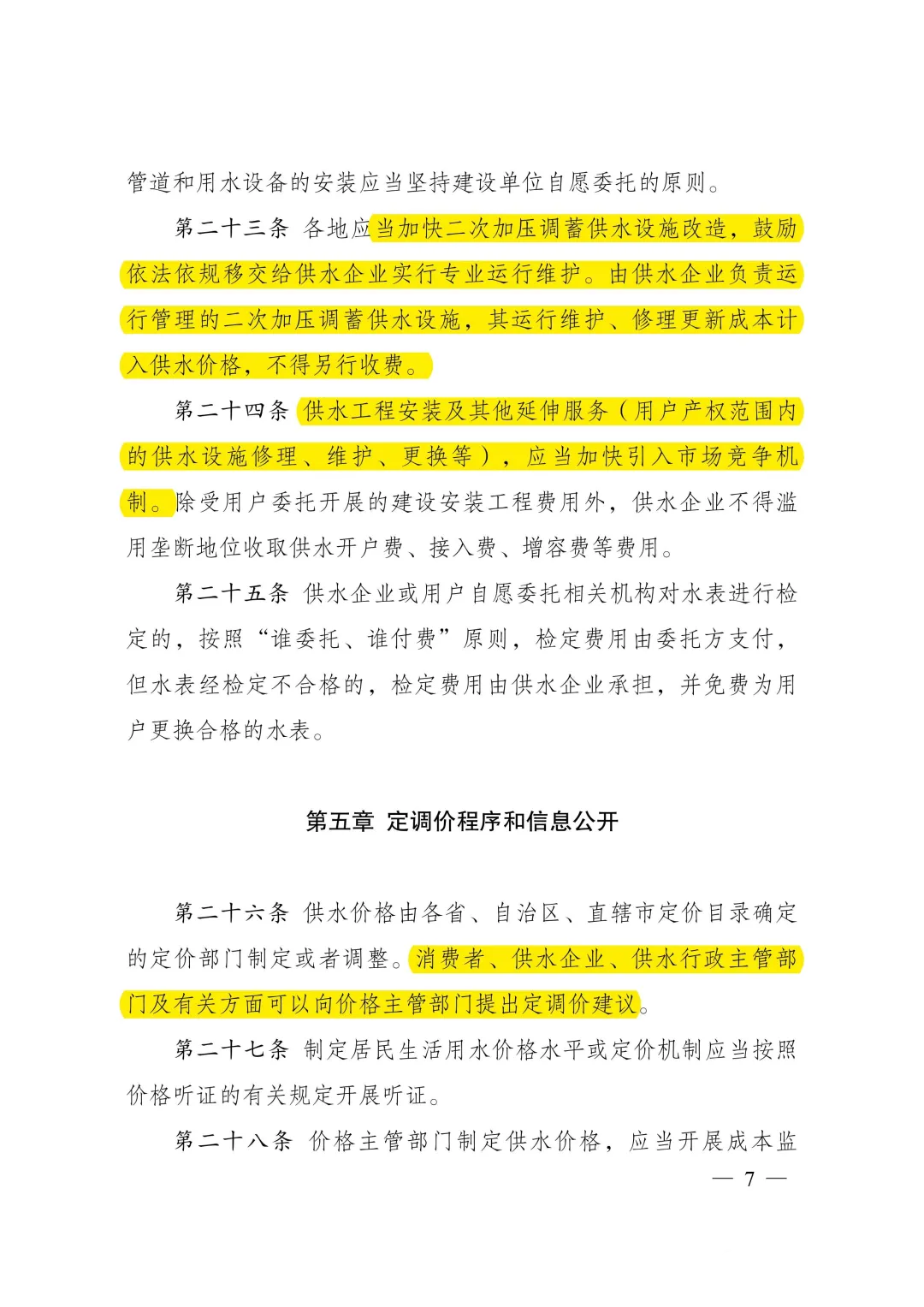 答:《城鎮(zhèn)供水價(jià)格管理辦法》明確了城鎮(zhèn)供水價(jià)格的定價(jià)原則、定價(jià)方法、定調(diào)價(jià)程序,以及水價(jià)分類(lèi)、計(jì)價(jià)方式、規(guī)范供水企業(yè)服務(wù)收費(fèi)行為等。主要內(nèi)容:一是按照“準(zhǔn)許成本加合理收益”的方法核定城鎮(zhèn)供水價(jià)格。制定城鎮(zhèn)供水價(jià)格,以成本監(jiān)審為基礎(chǔ),通過(guò)核定準(zhǔn)許成本、監(jiān)管準(zhǔn)許收益確定準(zhǔn)許收入,根據(jù)核定供水量確定供水價(jià)格,并統(tǒng)籌考慮當(dāng)?shù)毓┧聵I(yè)發(fā)展需要、促進(jìn)節(jié)約用水、社會(huì)承受能力、服務(wù)質(zhì)量等因素。二是簡(jiǎn)化水價(jià)分類(lèi)、明確計(jì)價(jià)方式。城鎮(zhèn)供水根據(jù)使用性質(zhì)分為居民生活用水、非居民用水、特種用水三類(lèi),居民生活用水實(shí)行階梯水價(jià)制度、非居民用水實(shí)行超定額累進(jìn)加價(jià)制度。三是規(guī)范定調(diào)價(jià)程序、強(qiáng)化信息公開(kāi)。要求制定居民生活用水價(jià)格水平或定價(jià)機(jī)制應(yīng)當(dāng)按照價(jià)格聽(tīng)證的有關(guān)規(guī)定開(kāi)展聽(tīng)證,并進(jìn)行信息公開(kāi)。四是規(guī)范服務(wù)收費(fèi)行為、提升服務(wù)質(zhì)量。明確供水水質(zhì)、水壓應(yīng)當(dāng)符合國(guó)家規(guī)定標(biāo)準(zhǔn)。除受用戶(hù)委托開(kāi)展的建設(shè)安裝工程費(fèi)用外,供水企業(yè)不得濫用壟斷地位收取供水開(kāi)戶(hù)費(fèi)、接入費(fèi)、增容費(fèi)等費(fèi)用。