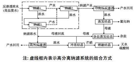 煤化工高鹽廢水主要來源于生產(chǎn)過程中的煤氣洗滌廢水、除鹽水系統(tǒng)排水、循環(huán)水系統(tǒng)排水、中水回用系統(tǒng)濃水等,溶解性總固體(tds)濃度通常>10000mg/l,廢水中na+、cl-和so2-4濃度之和占離子總量的80%~90%以上。目前,主要采用預(yù)處理-納濾分離-反滲透濃縮-蒸發(fā)/冷凍結(jié)晶組合工藝實現(xiàn)高鹽廢水零排放,反滲透產(chǎn)水進(jìn)行回用,同時副產(chǎn)nacl和無水na2so4結(jié)晶鹽。