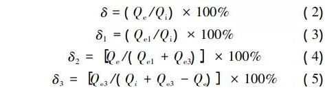 式中:δ、δ1、δ2、δ3分別為納濾系統(tǒng)和納濾1、2、3子系統(tǒng)的水回收率;qi為納濾系統(tǒng)(也是納濾1子系統(tǒng))的進(jìn)水流量,m3/h;qe為納濾系統(tǒng)(也是納濾2子系統(tǒng))的產(chǎn)水流量,m3/h;qe1為納濾1子系統(tǒng)的產(chǎn)水流量,m3/h;qe3為納濾3子系統(tǒng)的產(chǎn)水流量,m3/h。聯(lián)立式(2)—(5)求解,可以得出: