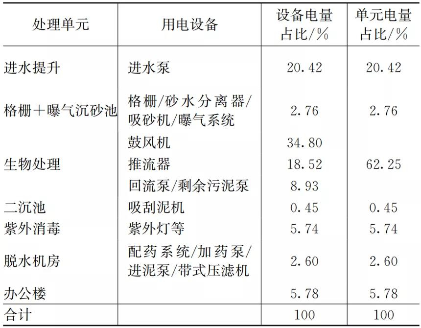 某座典型城市二級污水處理廠的電耗分布如表1所示。