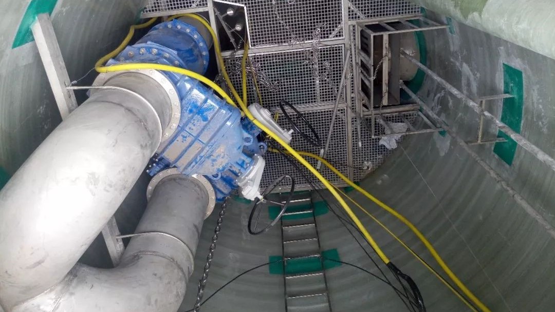 泵站泵站總設(shè)計排量為21.6萬噸/天,每個外筒直徑3.8米,高度約10.8米,筒體之間采用DN800管道連通,每個筒體內(nèi)置2臺德國進口潛水污水泵(90KW,1500m3/h@12.8m),配置帶油冷卻系統(tǒng)的電機,可以達到較低的運行液位,使排水更徹底,有效應(yīng)對降雨洪峰,處理水量大,排水迅速。