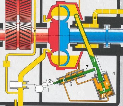 1執(zhí)行器 2凸輪 3勺管 4定位油缸 5控制閥 6控制閥芯 7控制導(dǎo)向套 8 勺管位置 9腔1 10腔2