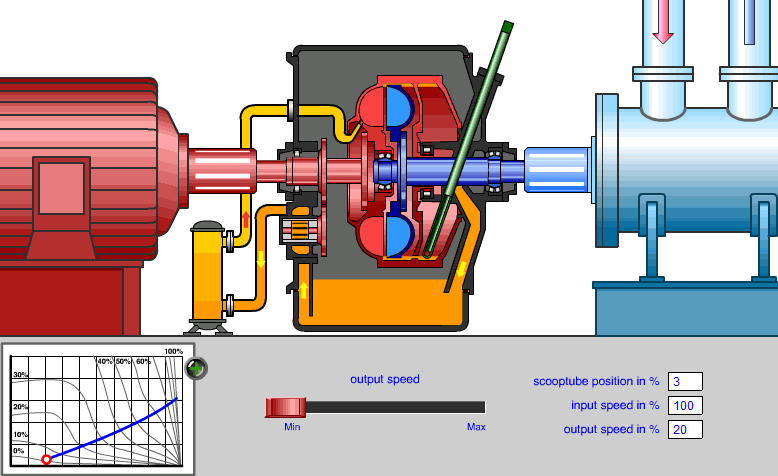 傳說中的無級變速是怎么實(shí)現(xiàn)的呢,有一個(gè)神奇的裝置是勺管,運(yùn)行人員通過在dcs中調(diào)節(jié)勺管的開度就可以改變給水泵的轉(zhuǎn)速,從而改變給水量。改變勺管的開度,最終目的是改變液力耦合器內(nèi)的工作油流量,從而改變傳動(dòng)的力矩和滑差(泵輪與渦輪的轉(zhuǎn)速差),最終按照工況的要求驅(qū)動(dòng)電動(dòng)給水泵。當(dāng)勺管深到工作腔最底部時(shí)(0%的位置),工作腔的工作油最少,這時(shí)的輸出速度最低。當(dāng)勺管移出(100%的位置),腔內(nèi)的工作油最多,這時(shí)的輸出速度最大。